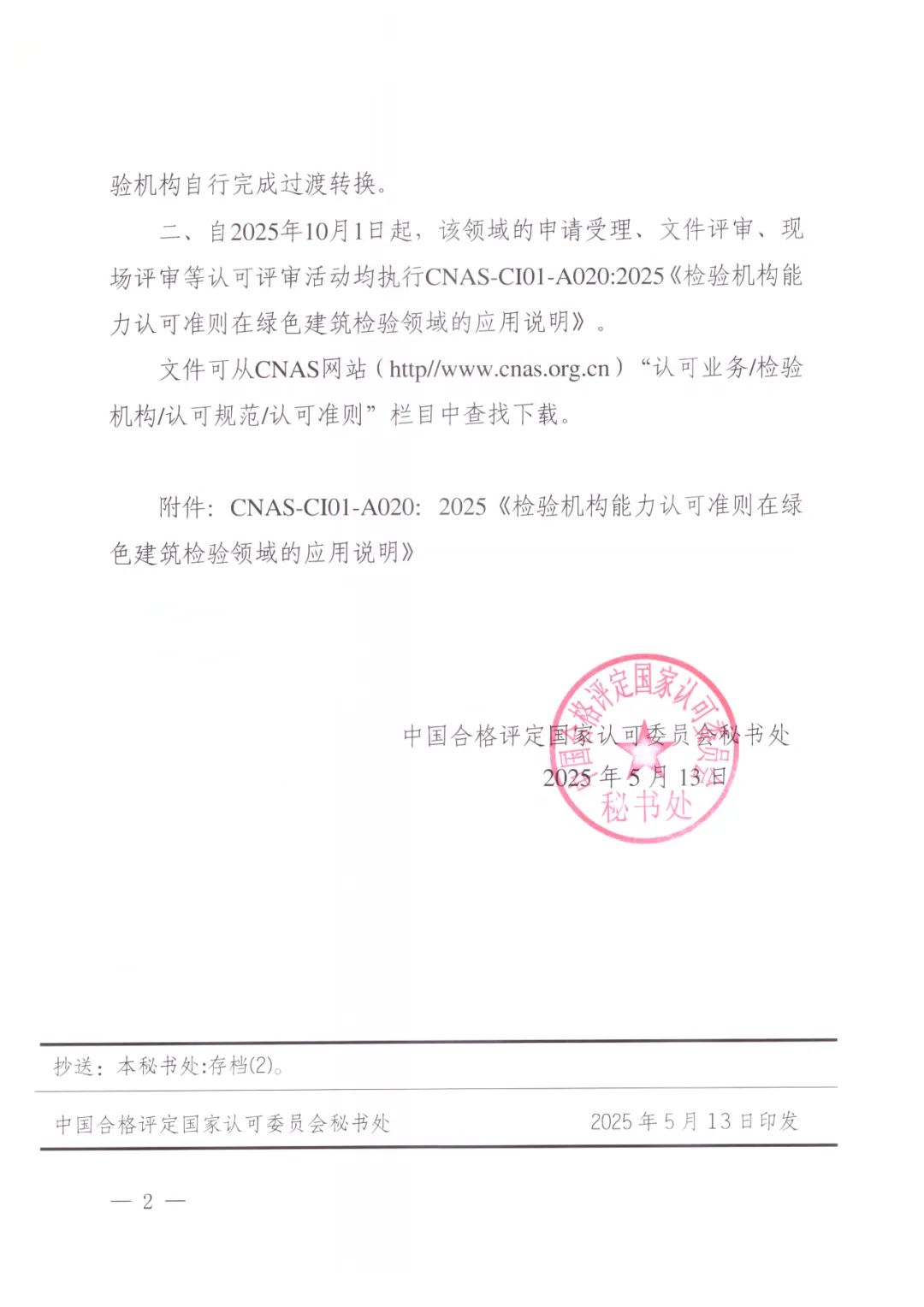 为进一步规范绿色建筑领域检验机构认可,中国合格评定国家认可委员会(CNAS)秘书处近期组织制订了CNAS-CI01-A020:2025《检验机构能力认可准则在绿色建筑检验领域的应用说明》,现已发布,将于2025年10月1日实施。